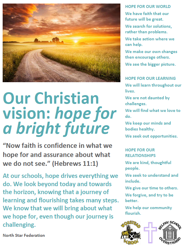These three underpin our school and are what makes it individual. As a Church of England school, they are particularly distinct. As part of the North Star Federation, The Belfry has shared characteristics with its partner school, Worstead, and also individual characteristics of its own.